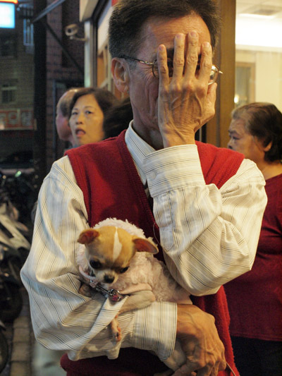 本來要拍米粉抱抱,貢丸阿公一聽,趕緊把臉遮起來...